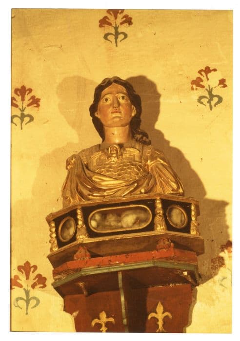 Sainte aux cheveux longs, retombant sur l'épaule gauche. Elle porte un vêtement orné d'une tête d'angelot sur son buste.