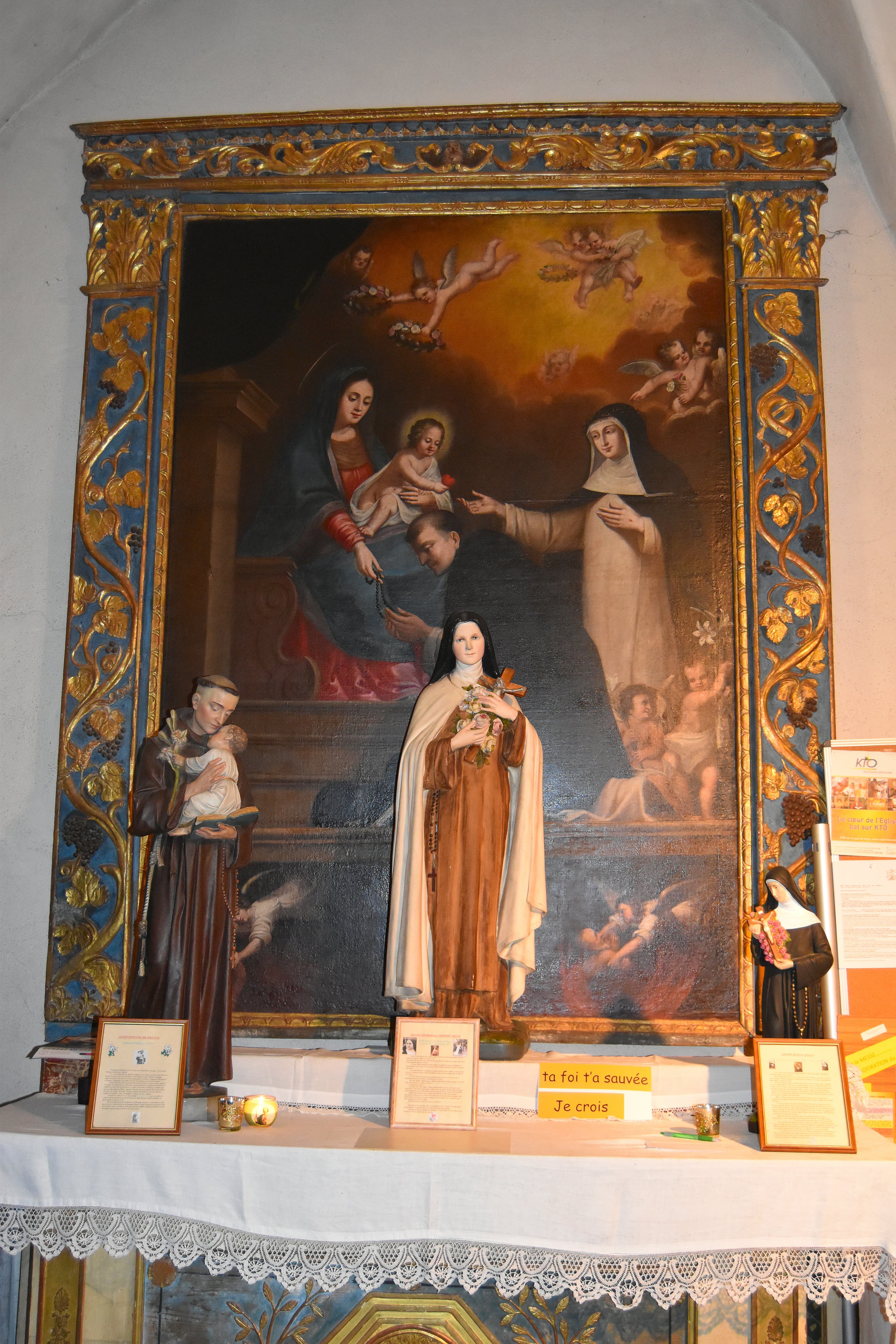 retable et tableau d'autel : Notre Dame du Rosaire avec Saint Dominique, Sainte Catherine de Sienne et les âmes du Purgatoire