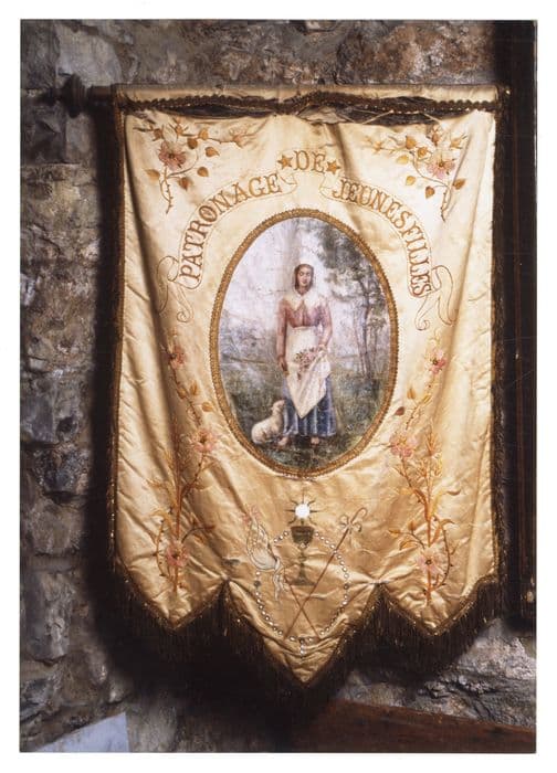Bannière ornée, d'un côté, d'un médaillon comportant une représentation imprimée de sainte Germaine en bergère. Soie blanche brodée de fils d'or.