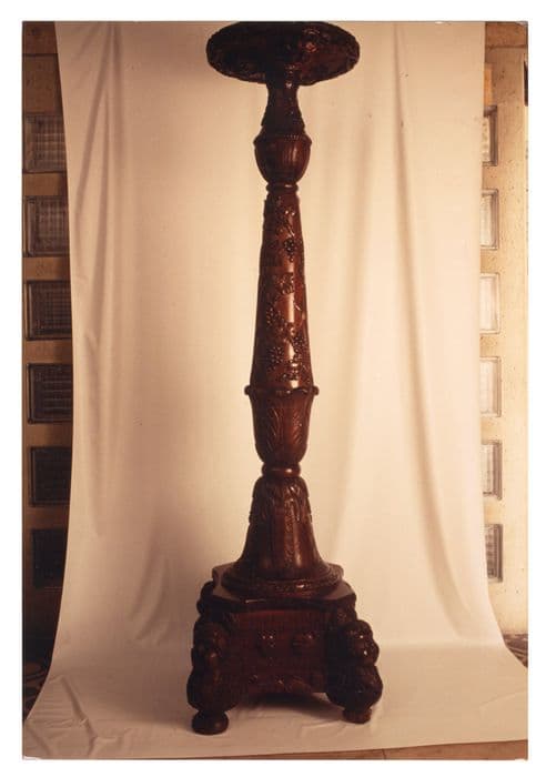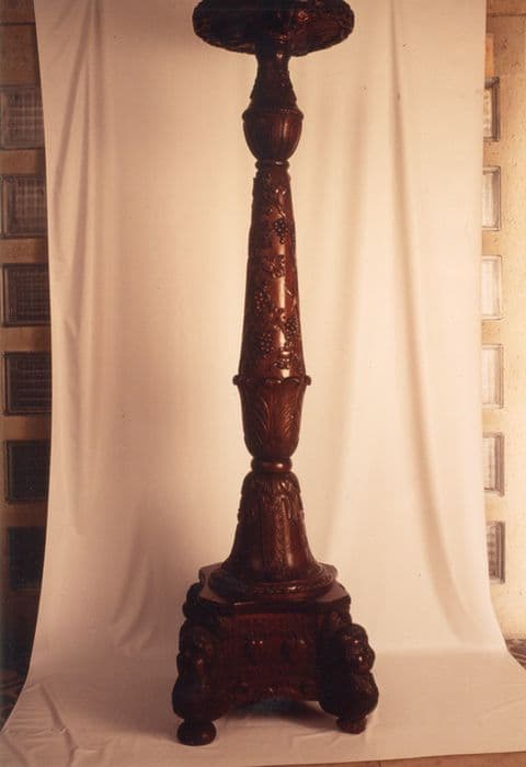 Socle quadripode, surmonté d'un fût à balustre orné de pampres de vigne. Bobèche circulaire.