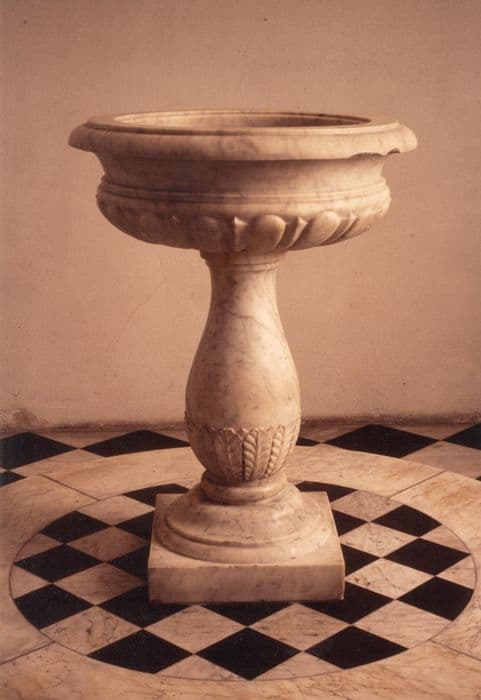 Bénitier en marbre blanc. Socle carré, pied circulaire et fût orné de feuilles stylisées à la base. Coupe circulaire ornée de godrons.