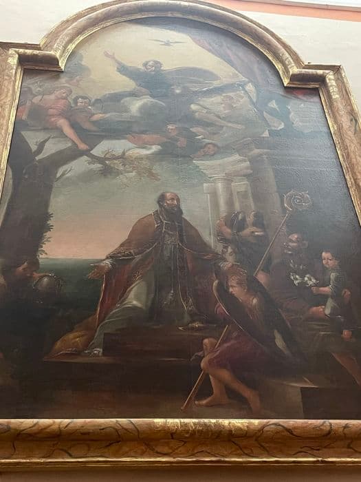 tableau et son cadre : Saint Hilaire aux pieds de Dieu le Père et du Saint Esprit