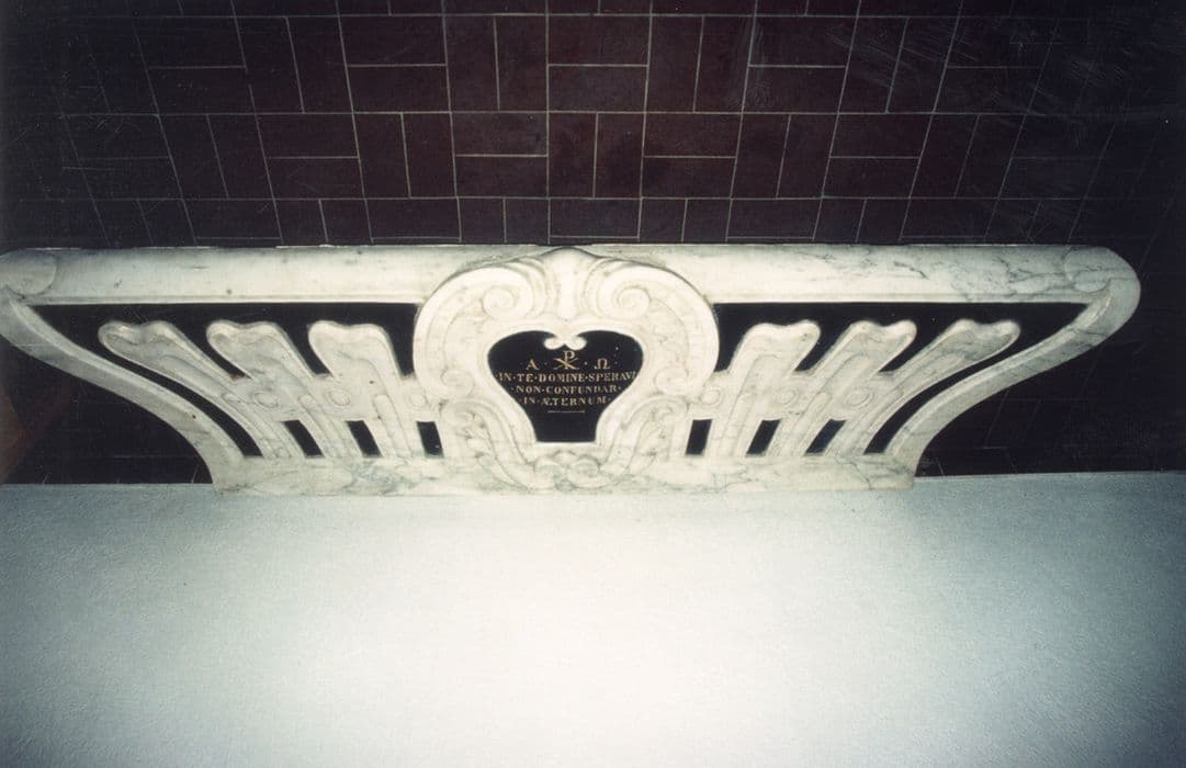 Autel en marbre blanc et noir, aux angles en volutes. Il est orné d'un cartouche central comportant des inscriptions en lettres d'or.