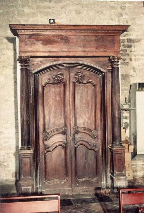 Porte à deux vantaux, au sommet cintré. Elle est orné de panneaux moulurés de style rocaille. Cette porte possède un encadrement architecturé constitué de deux colonnes cannelées reposant sur un haut soubassement et soutenant un entablement lisse.