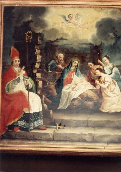 Le saint, vêtu en évêque, est assis au premier plan. Scène de la Nativité au sein d'une ruine, au second plan.