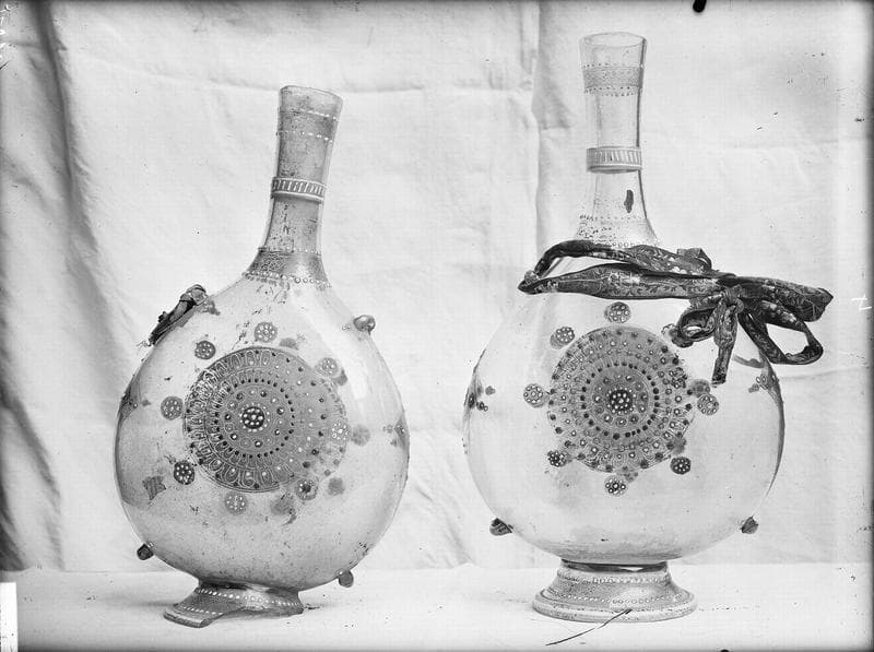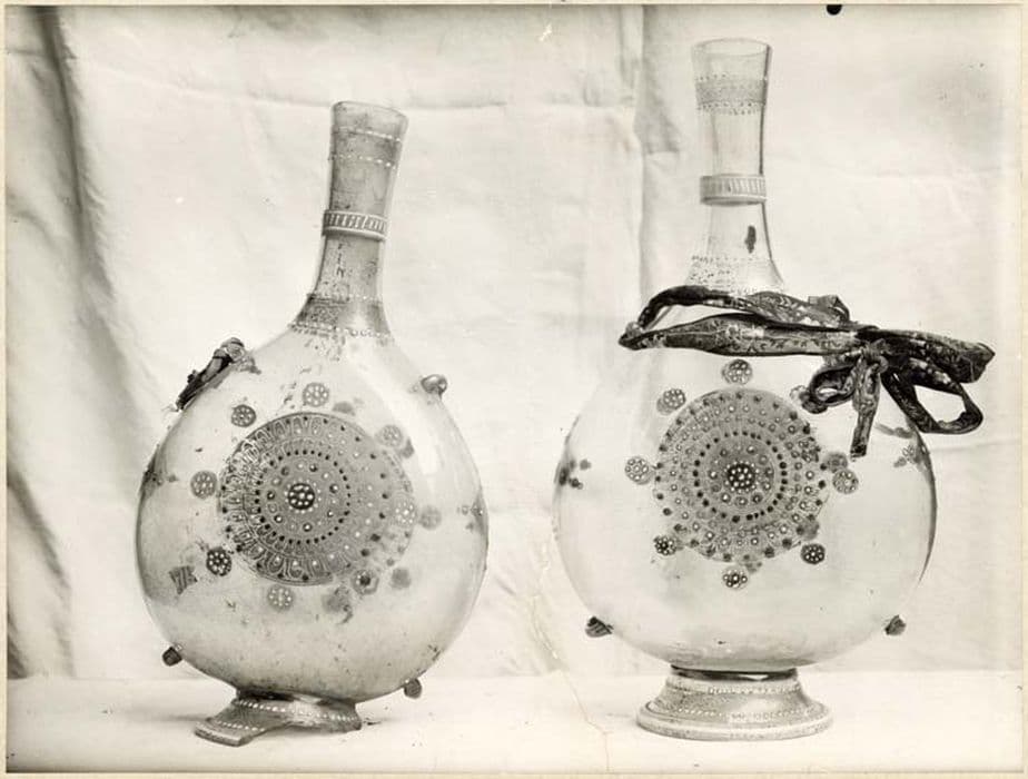Buire en verre blanc, à panse aplatie, décorée de rehauts d'or et d'émaux.