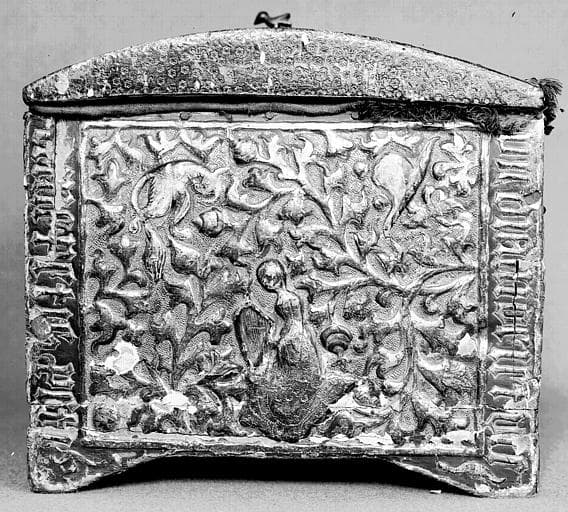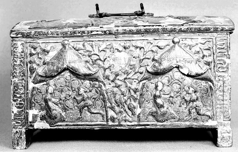 Coffrets de mariage en bois recouverts de pâtes gauffrées et dorées, au décor en relief.