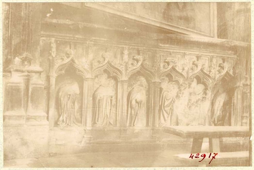 Le tombeau est orné d'arcatures ogivales, dans chacune desquelles figure une statuette de moines (mutilées). Du gisant, il ne reste plus que des traces.