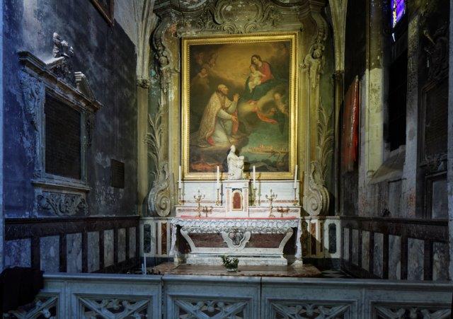 Ce petit groupe sculpté se trouvait posé sur l’estrade, en avant de l’autel de la chapelle Saint-Agricol, première chapelle latérale, à main droite en entrant dans la nef. Précédemment posée sur la table de l’autel, la statue aurait été déposée au sol, il y a plus d’un an (photographie de 2017), en raison d’un affaissement de l’autel.
