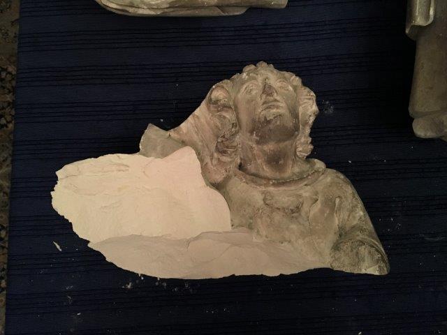 Suite à un acte de vandalisme le 21 janvier 2019, le groupe sculpté est brisé en morceaux : 5 fragments de 14 à 32 cm de hauteur (partie inférieure de la statue, tête et côté droit du buste de l’évêque, buste du personnage béni, drapé) et environ 10 petits fragments.