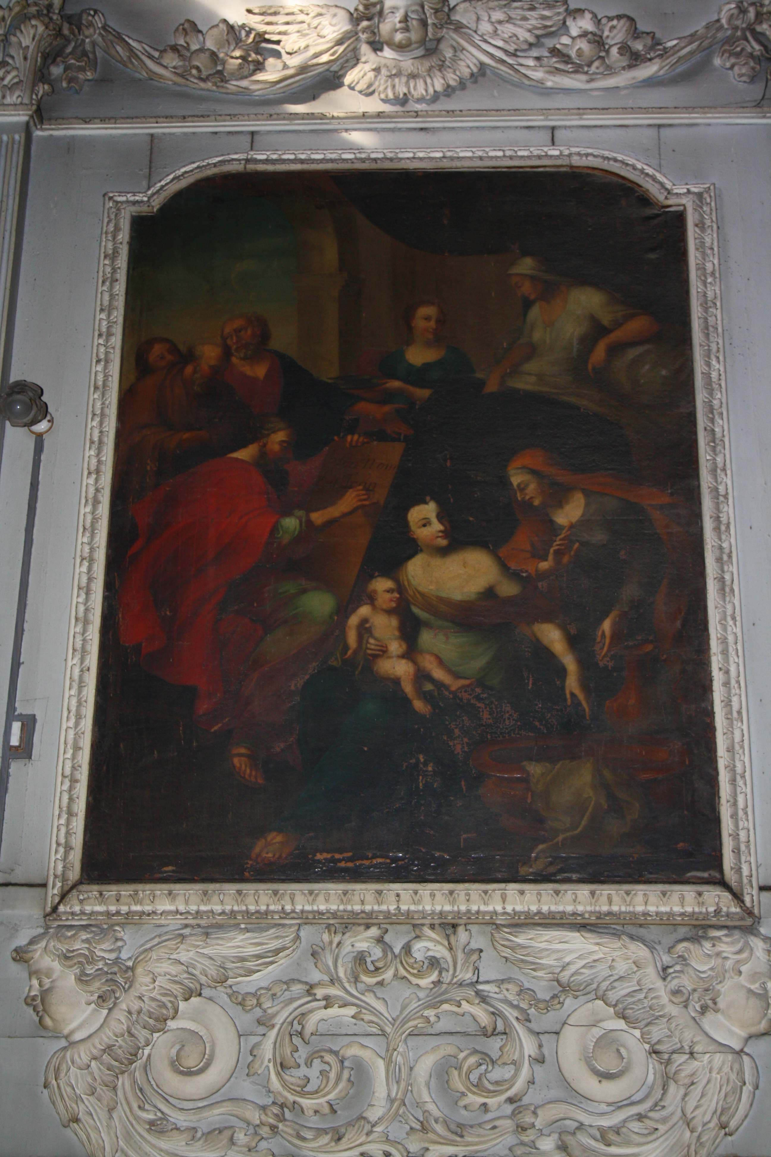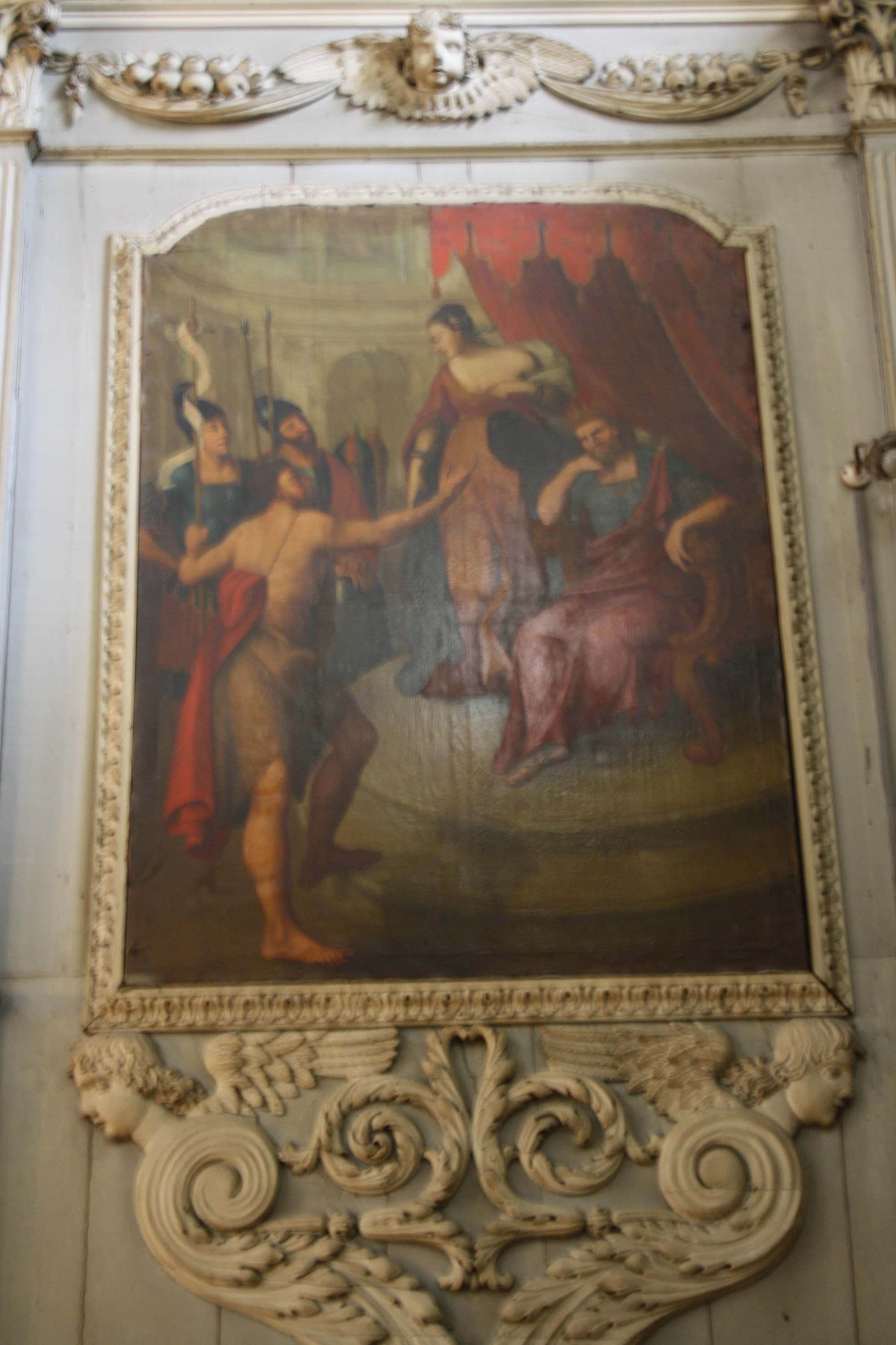 POP | Plateforme ouverte du patrimoineretable, lambris de revêtement (boiseries), bas-relief de la boiserie, tableau : Scène d'intérieur, naissance et "baptême" (du nom) de Jean-Baptiste, tableau : Jean Baptiste prêchant à la cour d'Hérode