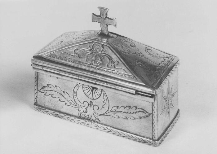 Boîte aux saintes huiles. Boîte rectangulaire fermée par un couvercle à quatre pans surmonté d'une croix découpée. Sur les faces avant et arrière de la boîte et sur les quatre faces du couvercle : décor de rinceaux et de feuillages. Sur les petits côtés de la boîte : une fleur à quatre grands et quatre petits pétales prolongés par des rayons. Sur le bord du couvercle, sur la base de la boîte et aux quatre angles : décor de chevrons irréguliers.