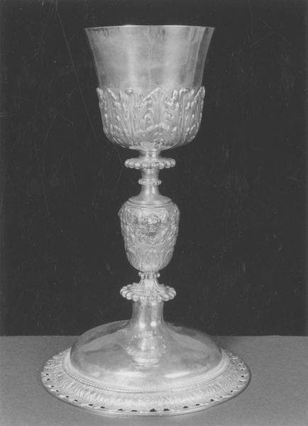 La coupe est garnie, à sa base, de feuillages qui en épousent la forme jusqu'à mi-hauteur. Le noeud, entre deux collerettes garnies de petites boules sur le pourtour, est orné de trois angelots. Le pied marqué à l'avant d'une croix gravée avec trois clous également gravés, est garni sur le pourtour de palmettes à peine ajourées au bord.