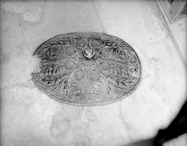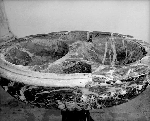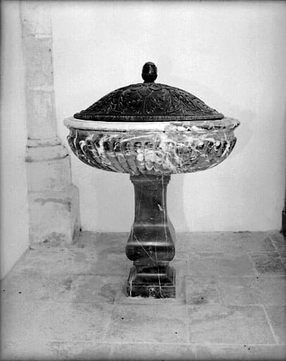 Pied de marbre noir veiné de blanc ; cuve en marbre noir et blanc à forme ovoïde, revêtue de strigiles en son pourtour ; couvert en bois de chêne artistiquement fouillé d'où se détachent des croix entrelacées de roseaux.