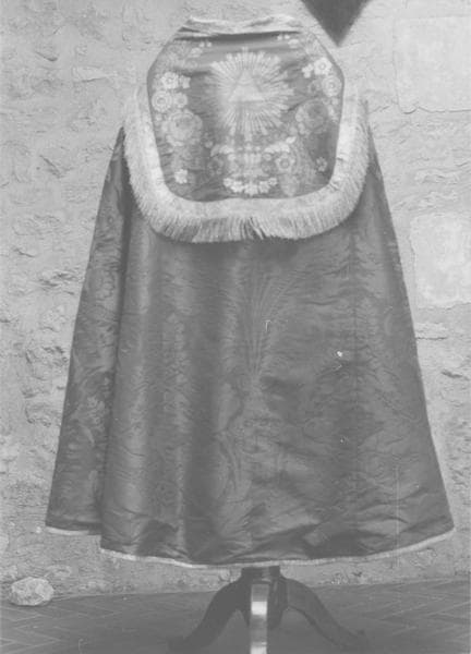 Chape, avec chaperon et orfrois, ornés de fleurs. Lampas rouge et broché de soie polychrome.