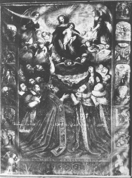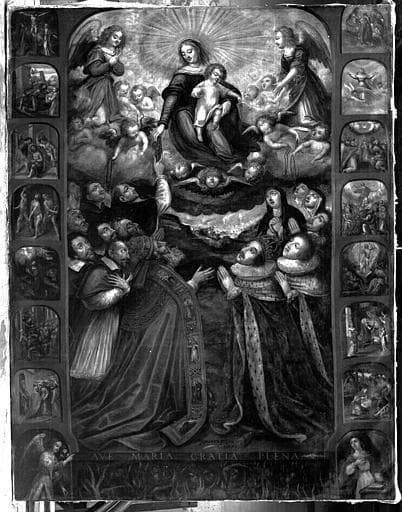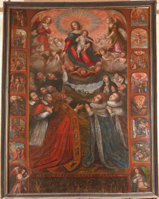 En haut de la toile, dans une gloire, la Vierge tenant l'Enfant sur ses genoux est entourée d'anges et d'angelots. Ellle tend, ainsi que trois des angelots, des chapelets à des religieux et religieuses. Au premier plan, à droite, le roi Louis XIII, la reine et Monsieur, frère du roi ; à gauche, le pape Urbain VIII, le cardinal de Richelieu, un religieux (le Père Joseph ?) et quelques autre personnages. Tous son agenouillés, le visage levé vers la Vierge. Au milieu de la toile, sous les pieds de la Vierge, la ville de La Rochelle en flammes (1628 est l'année où la ville se rendit au roi). Tout en bas de la toile (endommagée à cet endroit), on distingue une tête de personnage émergeant des flammes (représentation du Purgatoire ?). De chaque côté, encadrant la scène principale : huit petites scènes correspondant aux mystères du Rosaire. L'Annonciation est représentée par un ange, à gauche, saluant la Vierge, à droite ; entre-eux, traversant la toile, Ave, Maria, gratia plena.