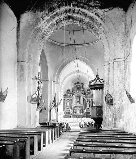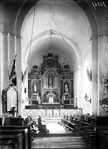Retable du maître-autel (sauf la partie centrale). Les parties supérieures et latérales (à l'exception des deux statues en plâtre des niches latérales) sont du 17e siècle. La statue en bois de sainte Radegonde, couronnée, tenant le sceptre de la main droite et présentant l'église de la main gauche, est de la même époque. La niche de la statue de la sainte, la toile peinte, les anges adorateurs, le tabernacle et l'autel semblent dater du 1er Empire.