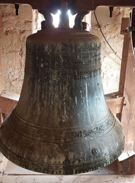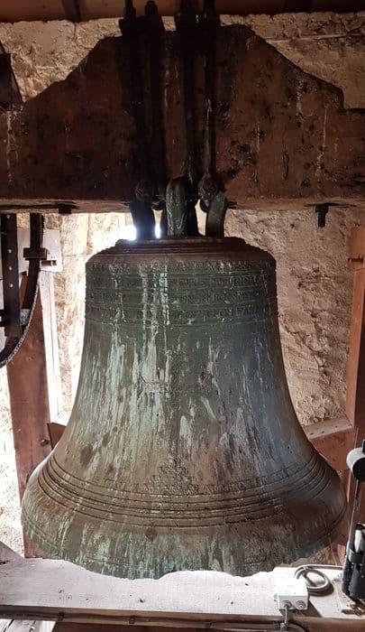 Grande croix décorée de rinceaux sur pied à 6 marches : ornées de 8-6-4-2 fleurs de lys, lesquelles entourent également le sommet de la cloche. De l'autre côté dans un médaillon, un coeur surmonté de trois clous et du monogramme du Christ avec croix.