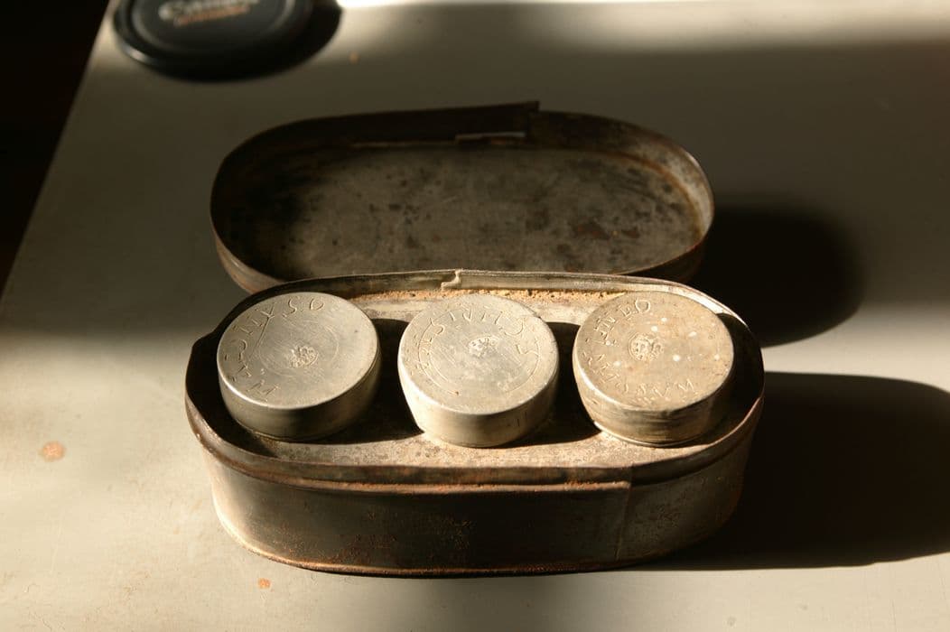 Boîte aux saintes huiles. Fer pour la boîte, ampoules en étain.