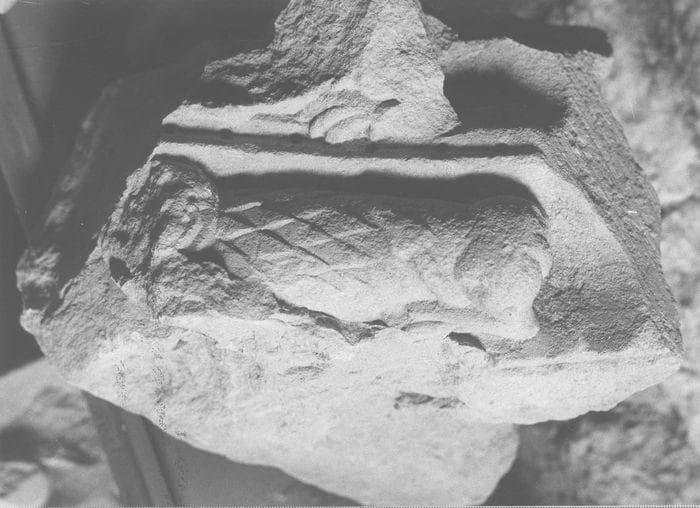 987-1-50. Claveau (fragment). Deux gorges soulignées par des anglets et ornées d'animaux fabuleux.