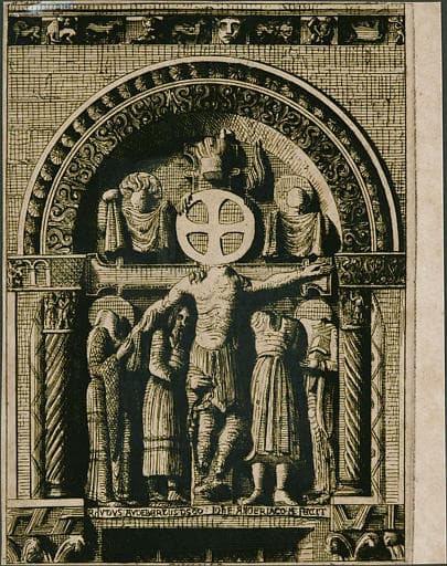 Planche coupée en deux parties : Descente de croix du portail et Maison avec loggia (maison Laurens).