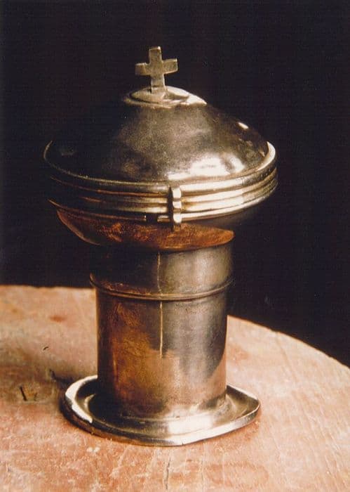 Ciboire des malades en argent, simplement orné d'une croix sur le dessus du couvercle.