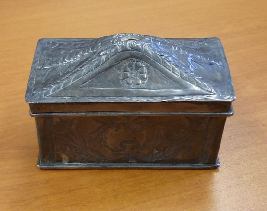 Le coffret aux saintes huiles en argent est de forme rectangulaire, fermé par un couvercle à quatre pans autrefois surmonté d'une croix.