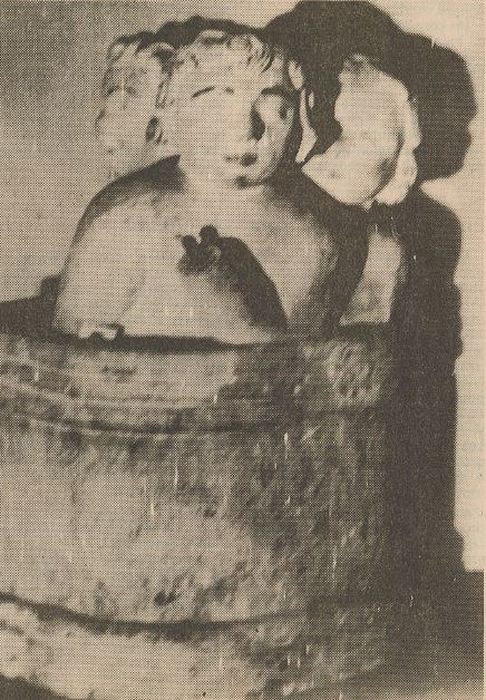 Fragment d'une statue en pierre de saint Nicolas dont il ne reste que le groupe des trois enfants dans un saloir.