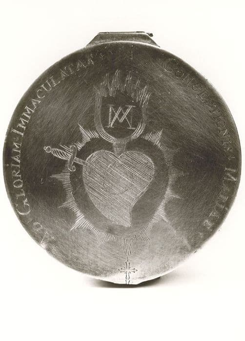 La face principale est ornée d'un décor gravé représentant un cur rayonnant percé d'un glaive et surmonté du monogramme de la Vierge entouré de flammes.