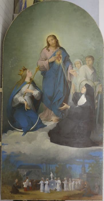 Dans la partie inférieure du tableau est figuré de le bourg avec son église et le bâtiment des surs (derrière la procession).