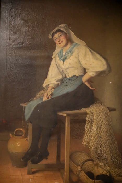 Portrait d'une jeune Sablaise dans un intérieur. La jeune femme souriante porte une tenue traditionnelle de travail (différente de la tenue de fête popularisée plus tard par le folklore) : coiffe, chemisier à motif, foulard, jupe noire recouverte d'un tablier, bas et sabots. Elle est assise sur une table et tient une aiguille de ramendage (ou ravaudage). Un filet de pêche est posé sur la table ; un panier d'osier avec un tricot et une cruche vernissée sont au sol. La toile dans un bon état général présente un jaunissement du vernis. Le cadre gris à l'origine a été repeint.
