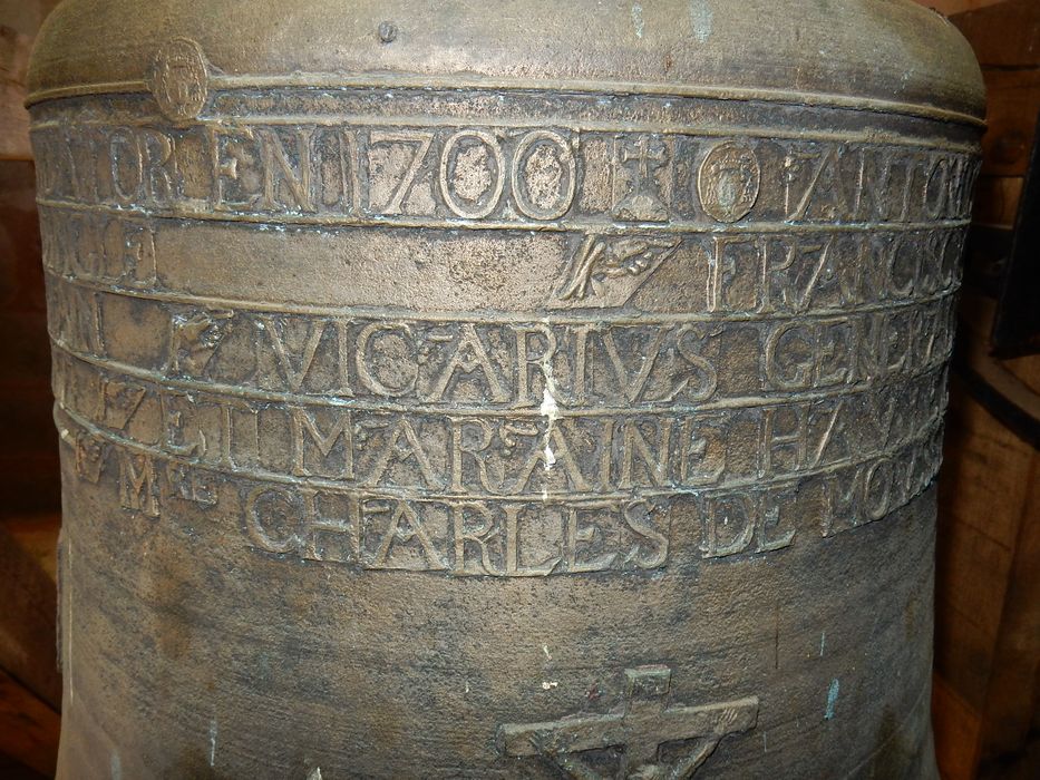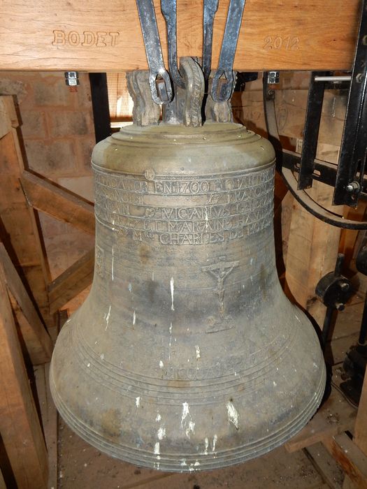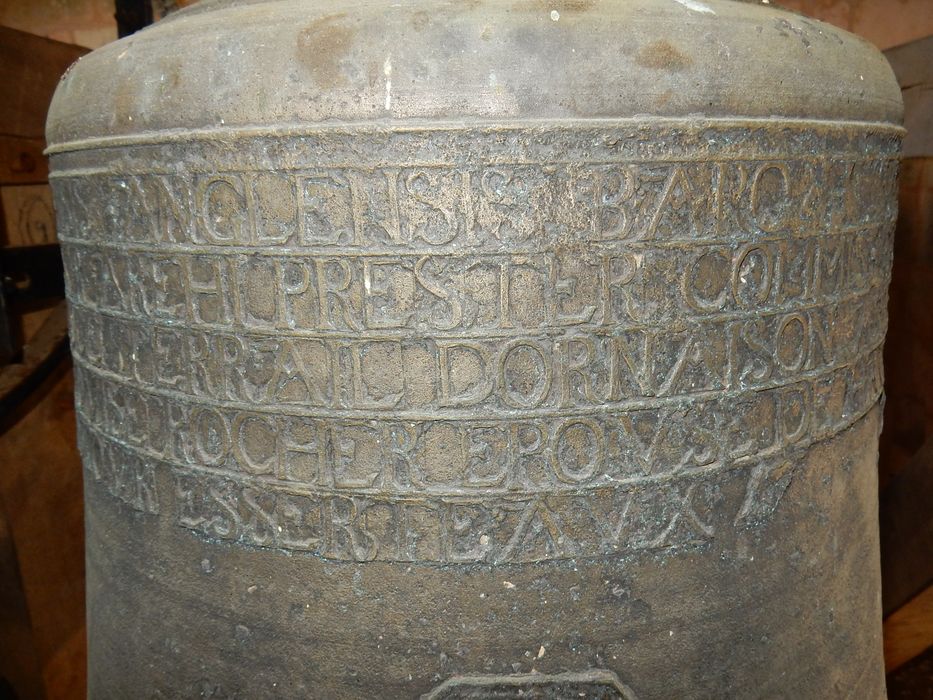 transcription : AN 1700 ANTONUIS EPISCOPUS PIETAVIENSIS, ANGLENSIS BARO HUJUS ECLESIOE FUNDATOR. FRANCISCUS MOREAU, PRIOR RECTOR ARCHIPRESTER COMMISUS... ABBATIS ANGLE. PARAIN VICARIUS GENERALIS MRE JEAN ; FRANÇOIS DE TERRAL D'ORNAISON, ABBE D'ANGLES. ET MARAINE HAUTE ET PUISSANTE DAME LOUISEROCHER, EPOUSE DE HAUT ET PUISSANT MRE CHARLES DE MOUSSY, SEIGNEUR DE LACONTOUR ESSERTEAUX. NICOLAS ET PIERRE AUBRY M'ONT FAIT