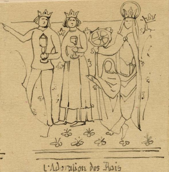 Adam, Eve, tentation£Jugement dernier£Annonciation, Nativité, Annonce aux bergers, Adoration des Mages£Les trois morts et les trois vifs
