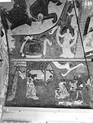 peintures murales : Création, tentation, Jean de Moussay et Pernelle Ebrard, Jugement, Annonciation, Nativité, Annonce aux bergers, Adoration des Mages
