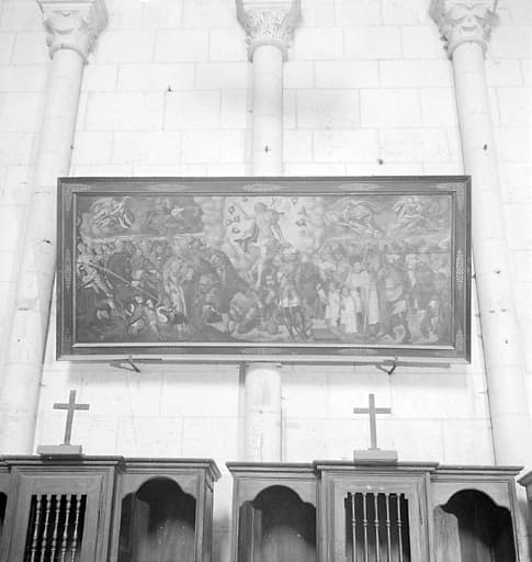 figure (La Résurrection, Christ, Les Evangélistes, saint Pierre, saint Paul, saint Georges, saint Sébastien, saint Antoine, saint Martin, saint Denis, saint Hilaire, saint Louis, évêque, saint André, moine, enfant de choeur, agenouillé, chanteur, agenouillé)