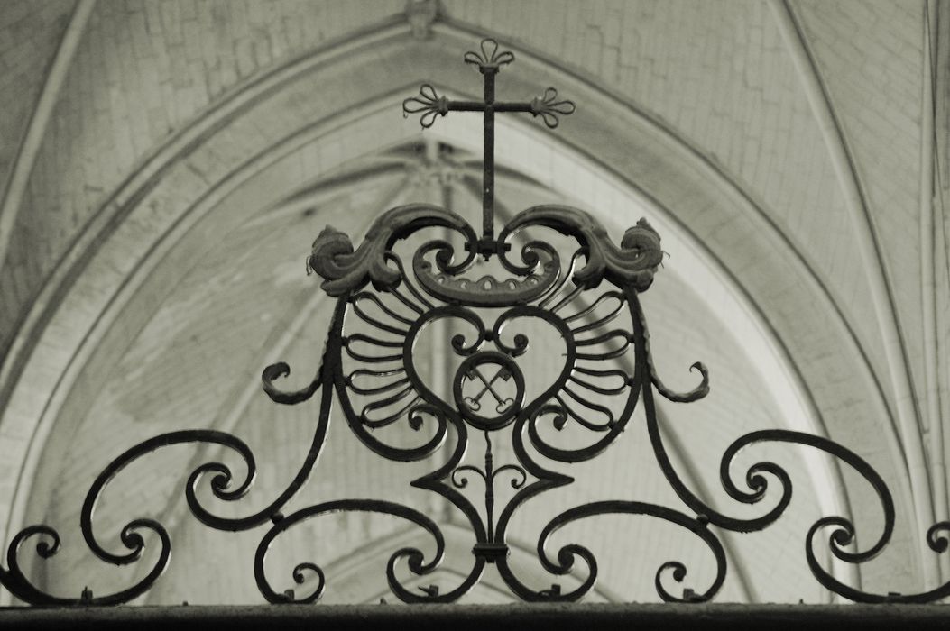 Cette grille est datée et son origine certifiée par les armes de Françoise de Laval, abbesse de Sainte-Croix de 1696 à 1726, ainsi que par la croix qui garnit un médaillon.