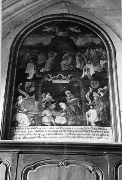 transcription : EN L'HONNEUR DE DIEU ET DE LA VIERGE MARIE, CE TABLEAU A ESTE DONE CEANS POUR AVOIR MEMOIRE DE FEUZ MESSIRE BERTRAND DE KNERINGEN, ESCUYER AMBASSADEUR EN ALLEMAIGNE POUR LE ROY FRANÇOIS PREMIER, ABBE DE SAINT SATUR, DOYEN DE CEANS, PRIEUR DE PARTHENAY LE VIEUX, DECEDDA A PARIS LE DERNIER DE FEBVRIER 1548, EST INHUME AUX CORDELIERS AUD LIEU. ENSEMBLE DE ME LOUYS FARDEAU, ESCUYER, SR DE BORS, CHAN. DE CEANS, PRIEUR DU BUSSEAU ET DE CHEFDEFOYS, QUI DECEDA LE 18 D'AOUST 1567