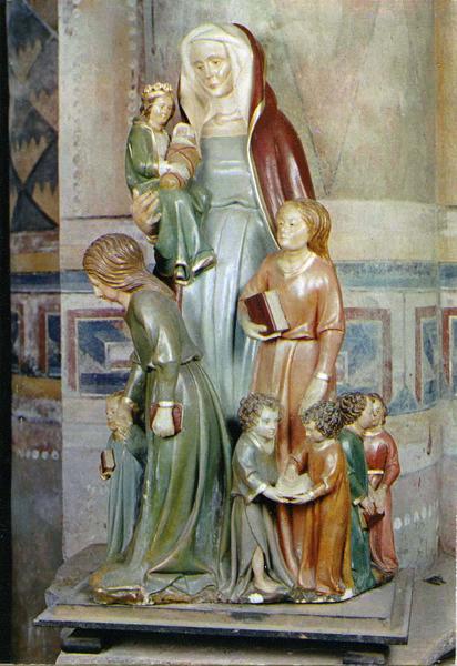 On observe 10 personnages dans ce groupe sculpté. Sainte Anne est le personnage le plus grand, elle est vêtue d'une robe longue, d'une guimpe, d'un voile et porte un long manteau couvrant le sommet de sa tête et tombant jusqu'au niveau de ses pieds. Elle tient dans ses bras Marie, vêtue d'une robe longue et d'un manteau. Elle est couronnée et porte dans ses bras l'enfant Jésus emmailloté. On retrouve deux autres personnages de taille moyenne (sans doute Marie-Jacobé et Marie-Salomé). Elles sont habillées toutes les deux de robes longues de couleur différente. On compte près de ces deux femmes cinq petits enfants.