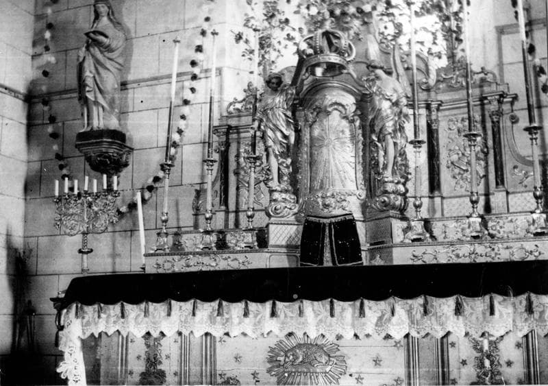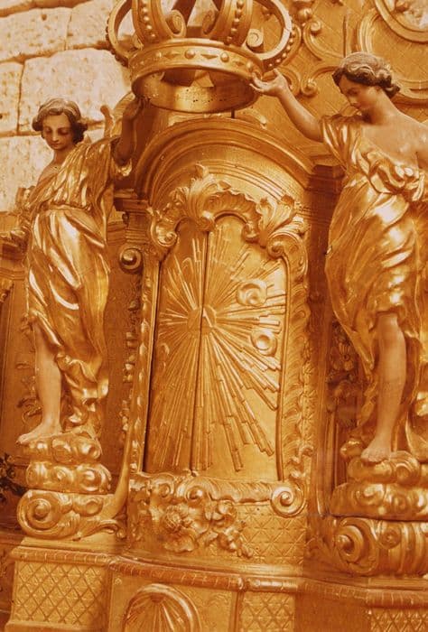 Tabernacle à deux étages ; l'étage inférieur est destiné à la conservation de l'eucharistie, l'étage supérieur à l'exposition du saint sacrement ; l'exposition du saint sacrement qui habituellement est faite sur un thabor placé au-dessus du tabernacle est ici la destination du tabernacle lui-même