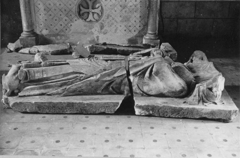 Il manque la tête, les mains, la crosse, la tête des deux angelots qui étendent un linge sous la tête du défunt, et la tête de l'animal qui se trouve sous ses pieds