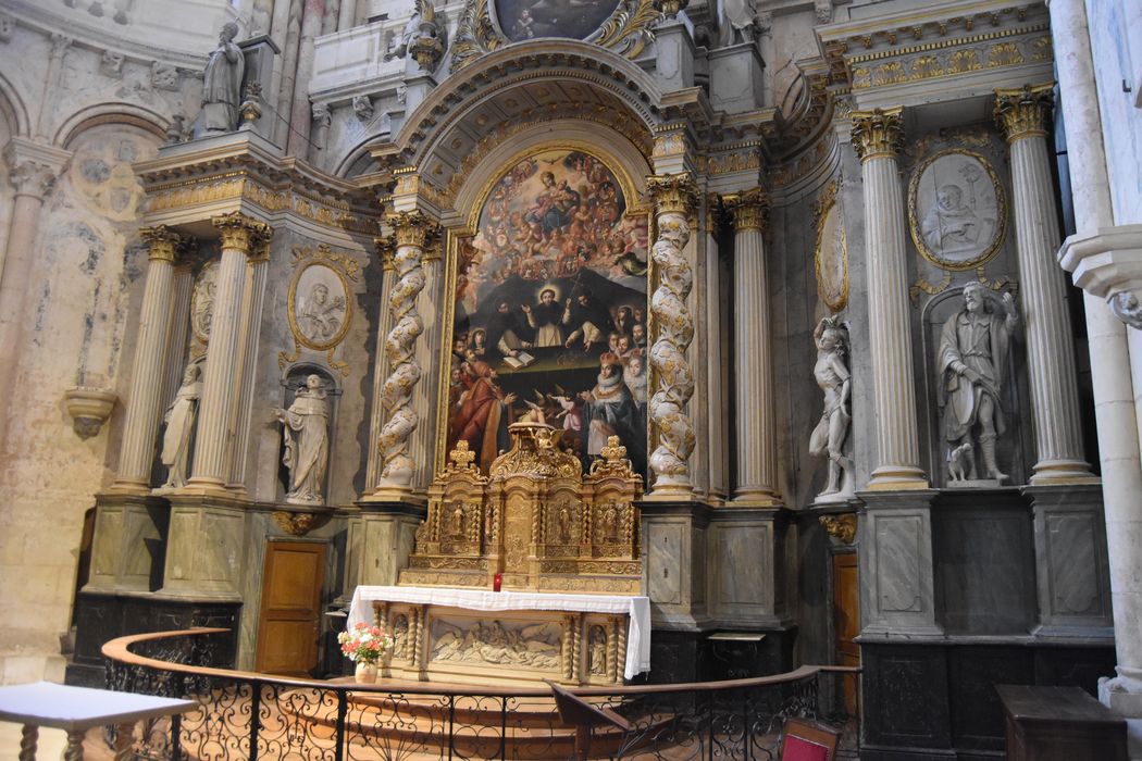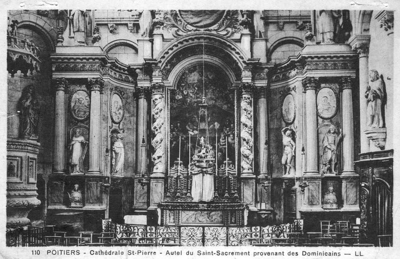 Archives départementales de la Vienne : marché passé avec le sculpteur en ce qui concerne la date ; ce retable fut transféré en 1792 à la cathédrale Saint-Pierre.