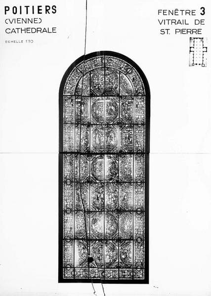 POP | Plateforme ouverte du patrimoine3 verrières : rédemption, Crucifixion, Résurrection, Ascension, Jugement et martyre de saint Pierre et saint Paul, Descente du Saint-Esprit, saint Pierre prêchant, saint Pierre et saint Jean bénissant la foule, résurrection de Tabitha, saint Pierre libéré de prison, chute de Simon le Magicien, saint Pierre et saint Paul comparaissant devant l'empereur, Jésus portant sa croix, saint Laurent amené devant un prince et des soldats, saint Laurent devant ses juges, un juge et le saint devant un prince et une foule de pauvres, visite du Christ à la prison du saint, le martyre de saint Laurent, l'enterrement de saint Laurent, le tombeau du diacre (baies 0, 1, 2)