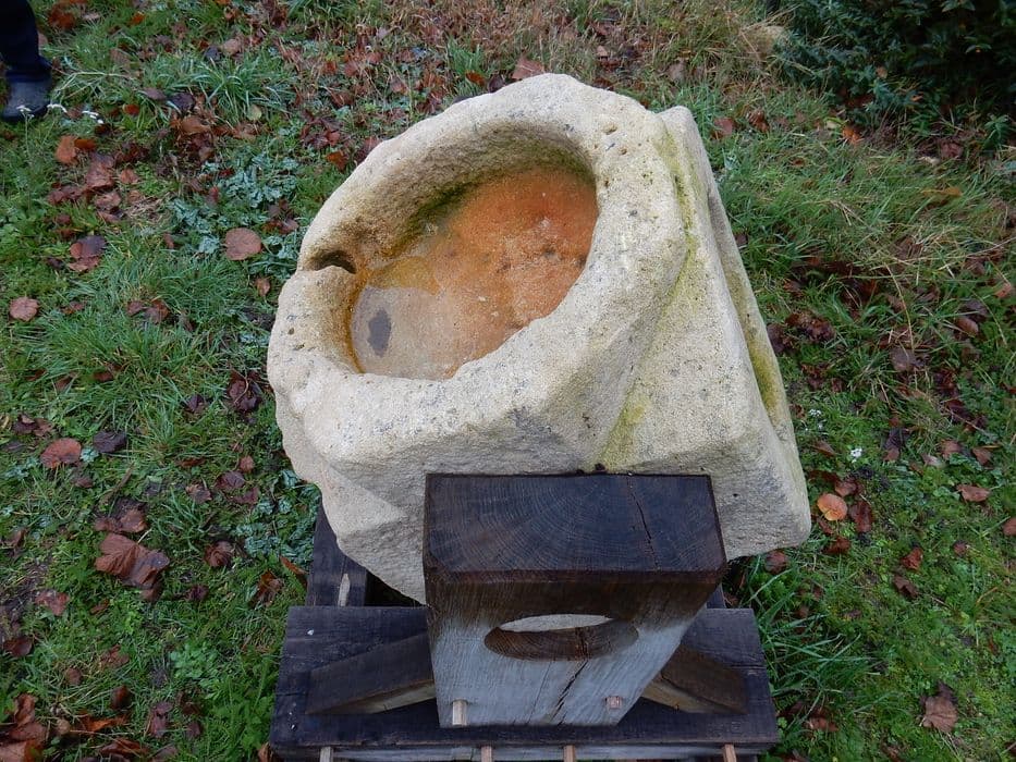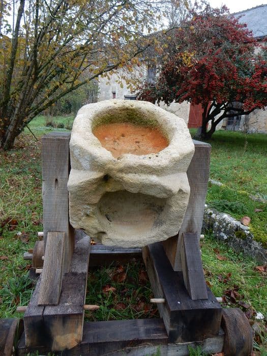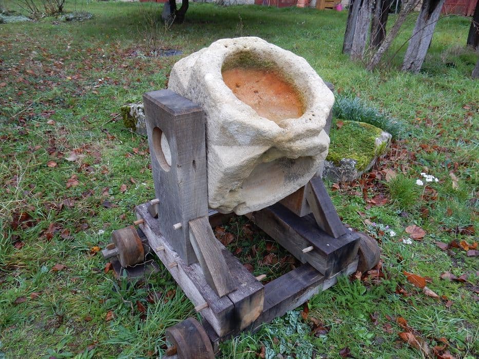 Mesure à grains d'environ 250 kg, taillée dans un bloc de pierre de 50 cm de côté, qui comporte quatre creusets de contenances différentes et de deux axes-rotules destinés à reposer sur une structure de bois.