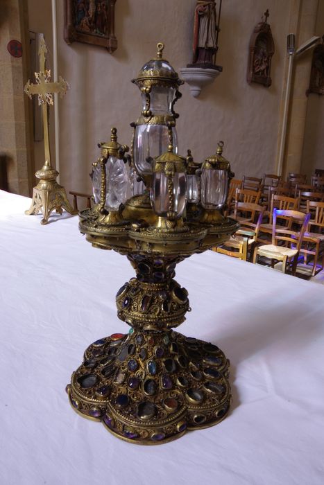Les réceptacles de ce reliquaire sont constitués par une ampoule centrale entourée de six autres en cristal de roche et insérées dans des montures de cuivre doré. Les ampoules sont placées sur un plateau à six lobes supporté par une tige resserrée au milieu où figure un important noeud placé au-dessus du pied, lui aussi polylobé. Chaque ampoule est fermée par un couvercle fixé par des charnières et surmonté par un bouton de préhension. Filigranes, perles baroques, verroterie et nombreuses pierres semi-précieuses montées à bâte (améthyste notamment) parfois taillées en intaille décorent l'ensemble. Des petits crochets de suspension sont visibles sur la tranche du plateau : des perles baroques y étaient peut-être fixées.