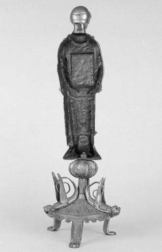 Ce reliquaire est formé par l'association d'une figure d'applique en cuivre doré et d'une base tripode dont la terrasse est émaillée. La statuette est repercée d'un regard en croix à double traverse, tandis que des petits cabochons de pierre et de pâte de verre sont montés à bâte. La base est surmontée d'un important noeud sphérique aplati à quartiers, décoré de perles de turquoise. La base circulaire est agrémentée de trois figures rapportées en cuivre doré et perles de turquoise.