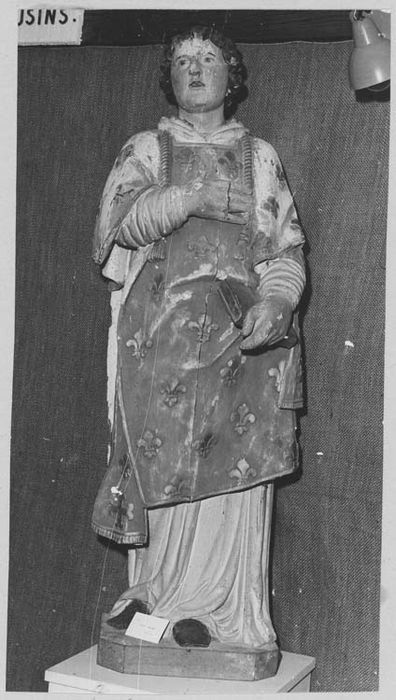 Le saint est représenté en costume de diacre avec une dalmatique ornée de fleurs de lys et d'un cordon à houppe sur chaque épaule, l'étole est également décorée de fleurs de lys. Il pose la main droite sur sa poitrine et tient un livre fermé dans l'autre.