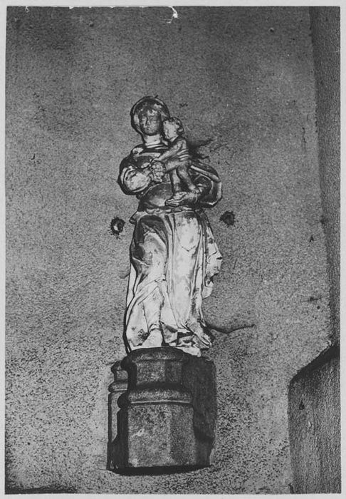 Traces de mutilation au pied et à la main gauche de la Vierge. Oeuvre restaurée en 1991 par l'atelier Groux à Blaslay (Vienne) : fixation de la tête, cassée, nettoyage de la statue (suppression du badigeon de chaux).