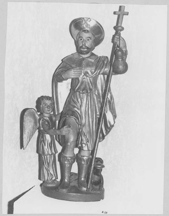 La statue comporte une terrasse semi-circulaire sur laquelle sont rapportée- s les figures de l'ange et du chien. Le bourdon est également rapporté, la gourde est fixée par une cordelette.