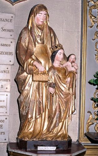 sainte Anne trinitaire (sainte Anne : panier, fruit, Vierge à l'Enfant : couronne, bouquet, Enfant Jésus : fruit : ?)