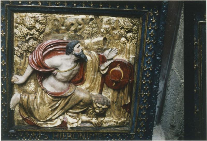 Inscription sculptée et dorée sur un décrochement formant cartel au niveau de la baguette inférieure du cadre : S HIERONIME.